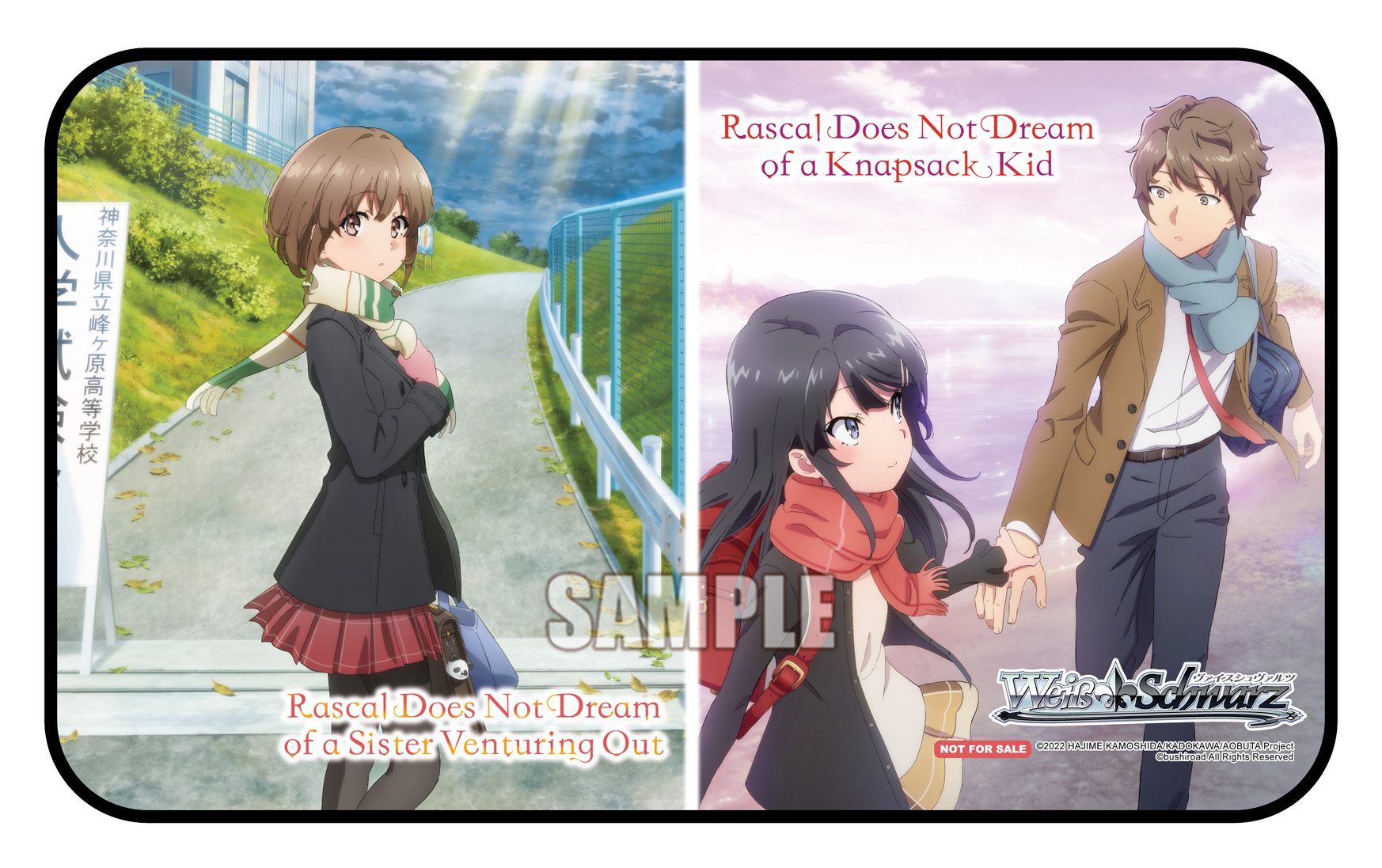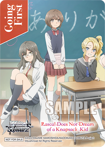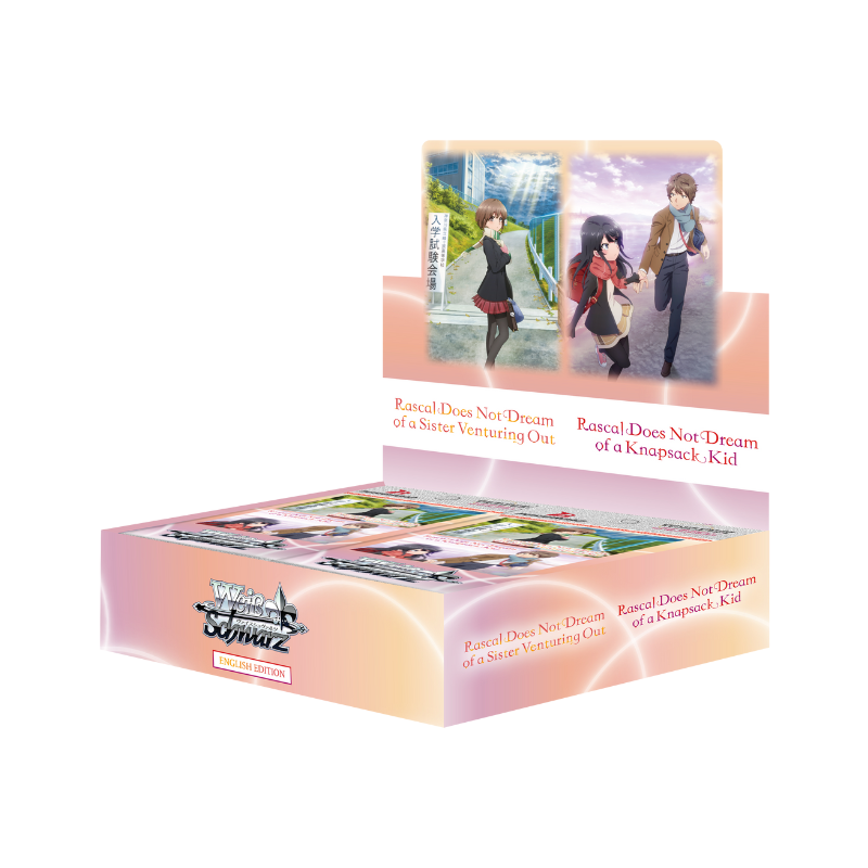 The "Rascal Does Not Dream" anime series once again returns to the stage of Weiss Schwarz! This Booster Pack contains scenes from the 2 movies, "Rascal Does Not Dream of a Sister Venturing Out" & "Rascal Does Not Dream of a Knapsack Kid". Second main release for the Rascal Dreams series, containing scenes from two different movies. Each pack contains a chance to include one of six different hot-stamped signature cards from the movies' voice actors.